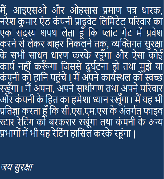 To conclude and sum it up all I feel immensely happy to launch this Safety Website of Naresh Kumar & Co. Pvt. Ltd. and dedicate to all the individuals who are related to the banner in any means or ways and sincerely hope that this shall add and strengthen values to our core principle.